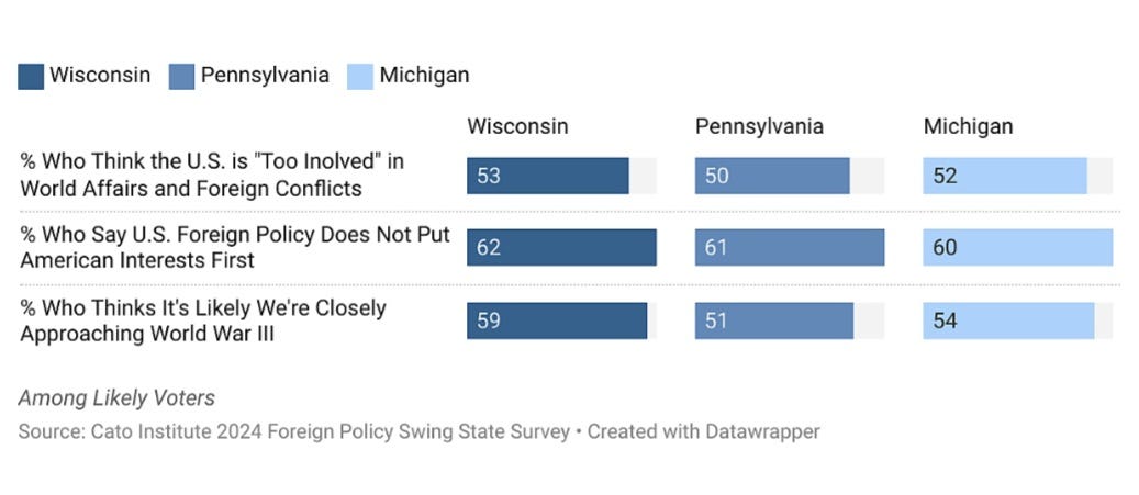 This chimed with the electorate. In the three swing states of Wisconsin, Pennsylvania and Michigan, all of which he won, polling two months before the election found that most voters felt the US was “too involved” in global conflicts, thought that US foreign policy doesn’t put American interests first, and feared that the US was “closely” approaching World War III.